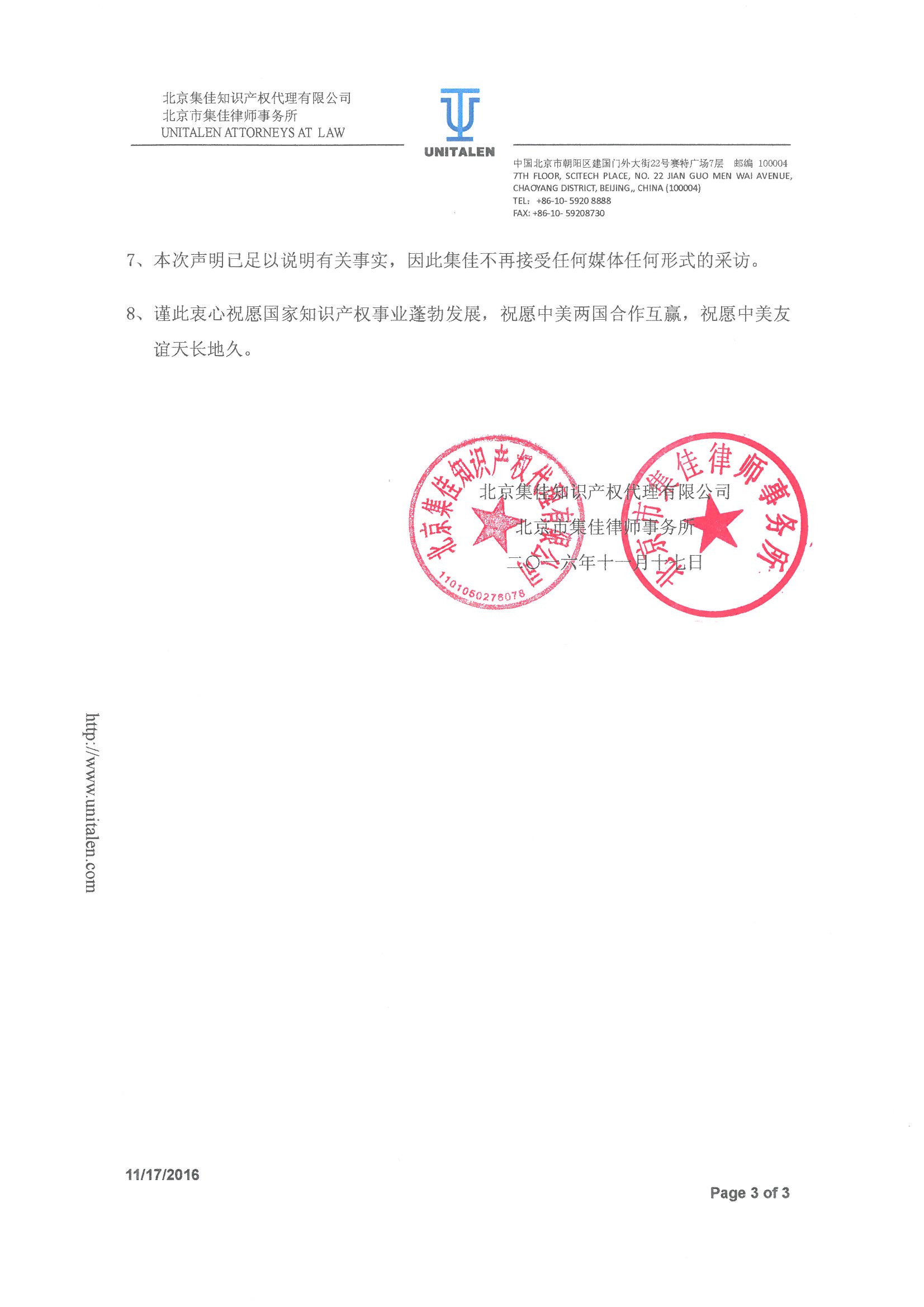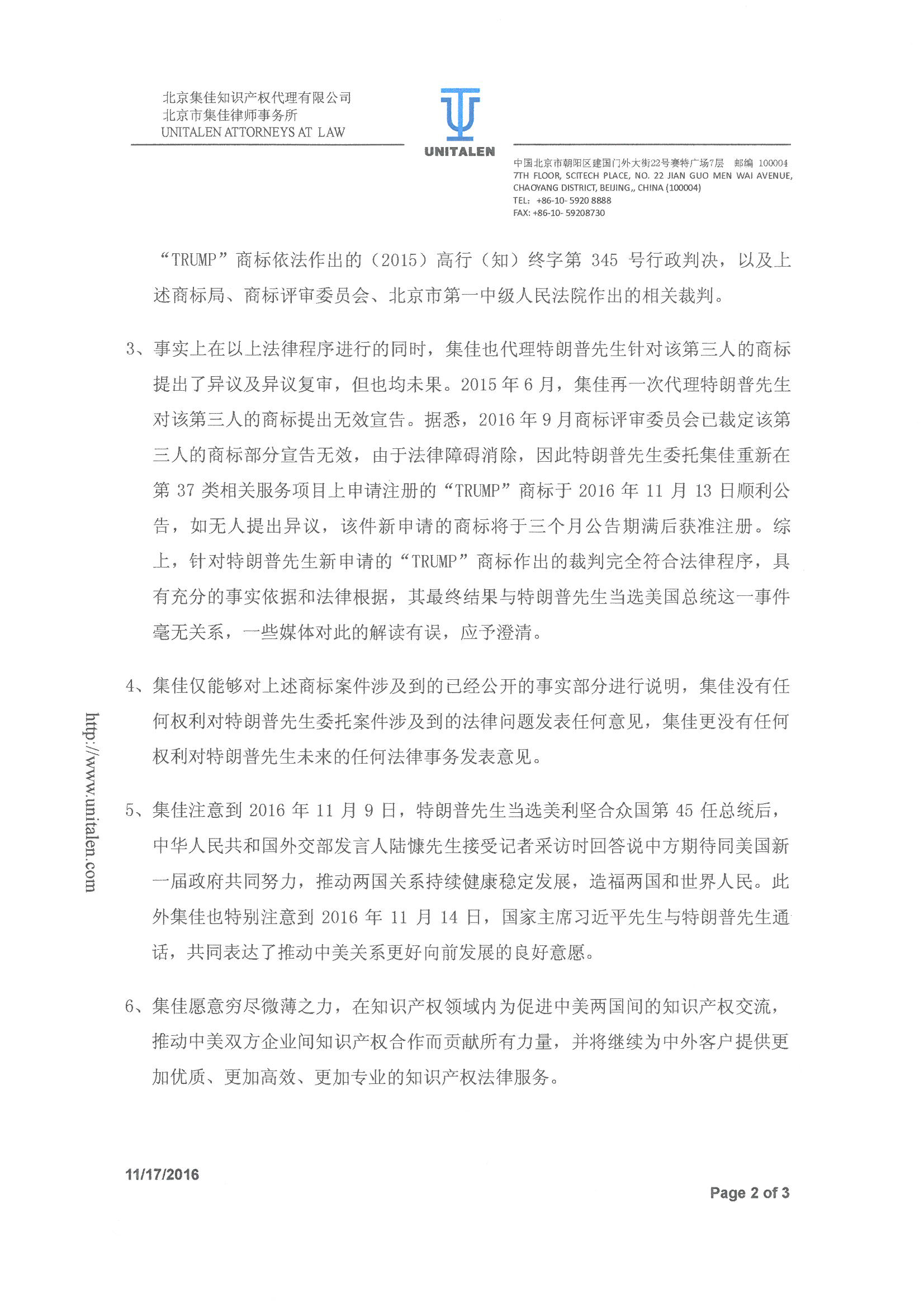 關于唐納德·特朗普先生委托北京集佳知識產(chǎn)權代理有限公司、北京市集佳律師事務所代理在華商標事務涉及事實問題的鄭重聲明 .pdf