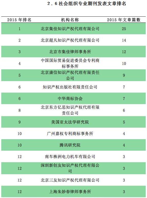 日前,上海知識(shí)產(chǎn)權(quán)研究所對(duì)2015年度我國(guó)知識(shí)產(chǎn)權(quán)專業(yè)文章發(fā)表情況進(jìn)行了統(tǒng)計(jì)分析,在包括科研院所、司法系統(tǒng)、政府部門、社會(huì)組織等各機(jī)構(gòu)文章發(fā)表總量排名中,集佳緊隨國(guó)家知識(shí)產(chǎn)權(quán)局、華東政法大學(xué)、北京市高級(jí)人民法院,以全年發(fā)表量25篇的成績(jī),領(lǐng)跑社會(huì)組織類機(jī)構(gòu)。此外,北京市集佳律師事務(wù)所以全年發(fā)表12篇的成績(jī)?cè)谏鐣?huì)組織類機(jī)構(gòu)排名中名列第三。