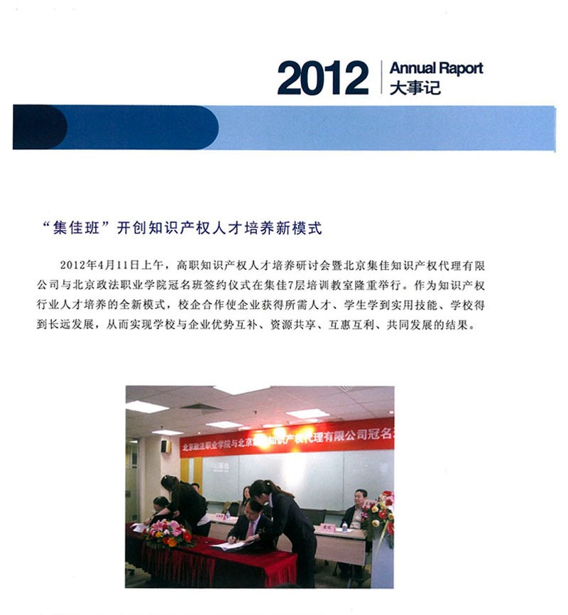 在北京市知識(shí)產(chǎn)權(quán)局近期公布的《2012年度北京市專(zhuān)利代理年報(bào)》中,“‘集佳班’開(kāi)創(chuàng)知識(shí)產(chǎn)權(quán)人才培養(yǎng)新模式”入選2012年行業(yè)大事記。