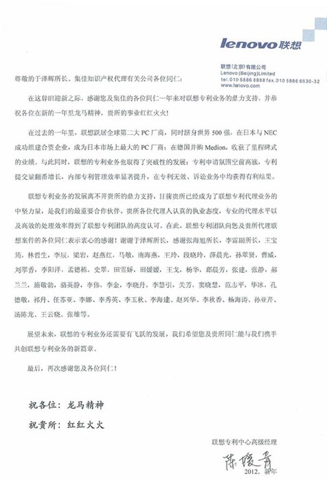 在新年即將到來之際,集佳收到聯(lián)想公司專利中心發(fā)來的新年感謝信,對(duì)集佳在專利工作上給予的大力支持表示感謝。在此,也感謝廣大客戶一直以來對(duì)集佳工作的信任與支持,今后我們將為企業(yè)提供更加專業(yè)和優(yōu)質(zhì)的知識(shí)產(chǎn)權(quán)服務(wù)。