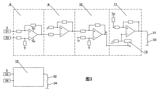 而涉案專利說明書給出了唯一的“具體實施方式”,即:懸浮體水平運動控制裝置包括:①帶鐵芯的四個線圈31、32、33、34;②四個霍爾元件傳感器(磁性傳感器)51、52、53、54,分成兩組分別控制兩組線圈,進而控制懸浮體X、Y方向的自由移動;③在底座內(nèi)還設(shè)置有控制電路板6,由完全相同的相對獨立的控制電路12組成;④控制電路12也僅僅給出一個具體實施方式,即傳感器電壓接入減法電路8(檢測電壓值),經(jīng)放大電路9(信號放大),與減法電路10的基準電壓U0進行比較,輸出到功放電路;當輸出電壓不為0時,進行勵磁電流的調(diào)整。如下圖: