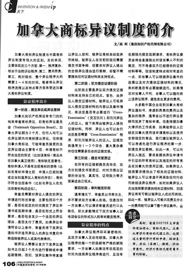 《中國發(fā)明與專利》:加拿大商標異議制度簡介