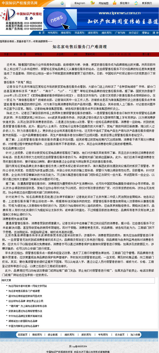 中國知識產(chǎn)權(quán)報資訊網(wǎng):知名家電售后服務(wù)門戶難處理