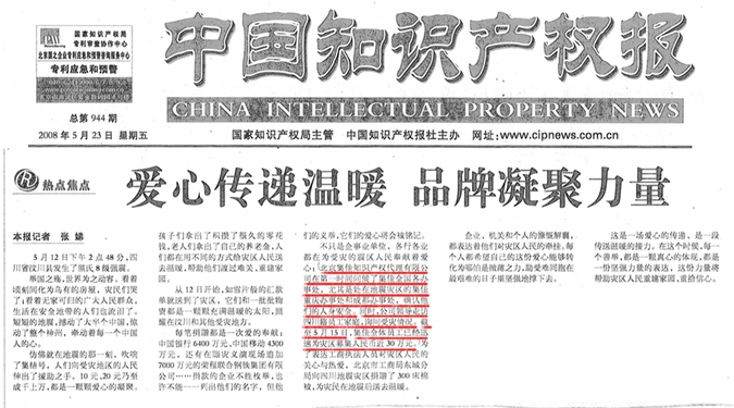 《中國知識產(chǎn)權(quán)報》:愛心傳遞溫暖 品牌凝聚力量