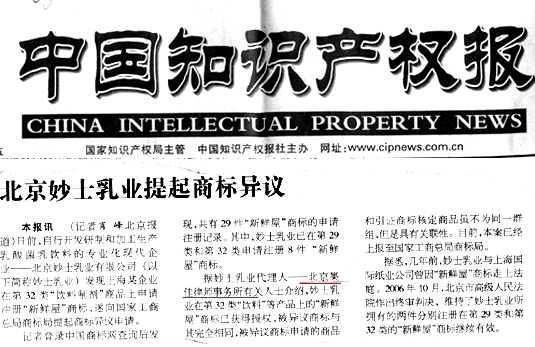 《中國(guó)知識(shí)產(chǎn)權(quán)報(bào)》北京妙士乳業(yè)提起商標(biāo)異議