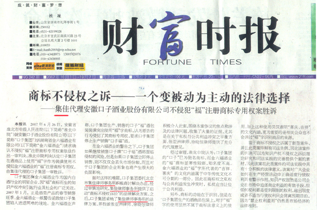 《財富時報》、《今日財富報》:集佳代理口子酒不侵犯“?!弊陨虡?biāo)專用權(quán)案