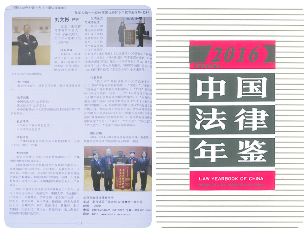 日前,由中國法學(xué)會主辦的《2016中國法律年鑒》正式出版發(fā)行,集佳律師事務(wù)所合伙人劉文彬律師入選“年鑒人物——2016年度優(yōu)秀知識產(chǎn)權(quán)專業(yè)律師”。