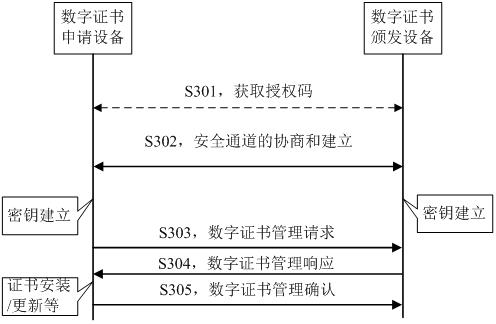 數(shù)字證書申請?jiān)O(shè)備利用所述安全數(shù)據(jù)通道向所述數(shù)字證書頒發(fā)設(shè)備發(fā)送數(shù)字證書管理請求消息,所述數(shù)字證書管理請求消息經(jīng)所述數(shù)據(jù)通信密鑰加密處理;