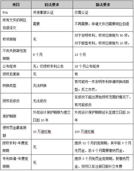 新法將不喪失新穎性的寬限期由6個月延長至12個月,且根據(jù)舊法只有出版物公開以及阿聯(lián)酋國家認可的展會中的披露才可以利用不喪失新穎性的寬限規(guī)定,在實踐中基本無法實施。根據(jù)新法,不喪失新穎性的披露行為擴展至任何國內(nèi)外的披露行為,包括展會展示、文章等。