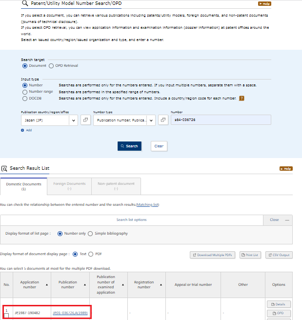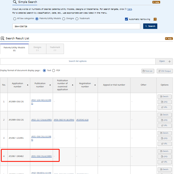 Patent/Utility Model Number Search/OPD能檢索出唯一的結(jié)果JP,01-036726,A(1989)。
