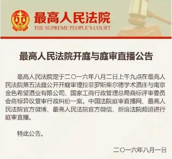 2016年8月1日最高法院通過其官方微博發(fā)布公告,公布了2016年8月2日將對(duì)“拉菲莊園”案開庭與庭審直播的消息。8月2日當(dāng)日,庭審?fù)ㄟ^中國(guó)法院庭審直播網(wǎng)、最高法院官方微博、最高法院官方微信、新浪法院頻道進(jìn)行了全程直播,庭審持續(xù)了5個(gè)多小時(shí)。