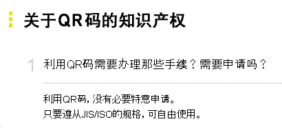 DENSO公司擁有QR Code二維碼的專利權,但明確表示不會行使已形成標準(ISO/IEC 18004)的QR碼相關權利2。