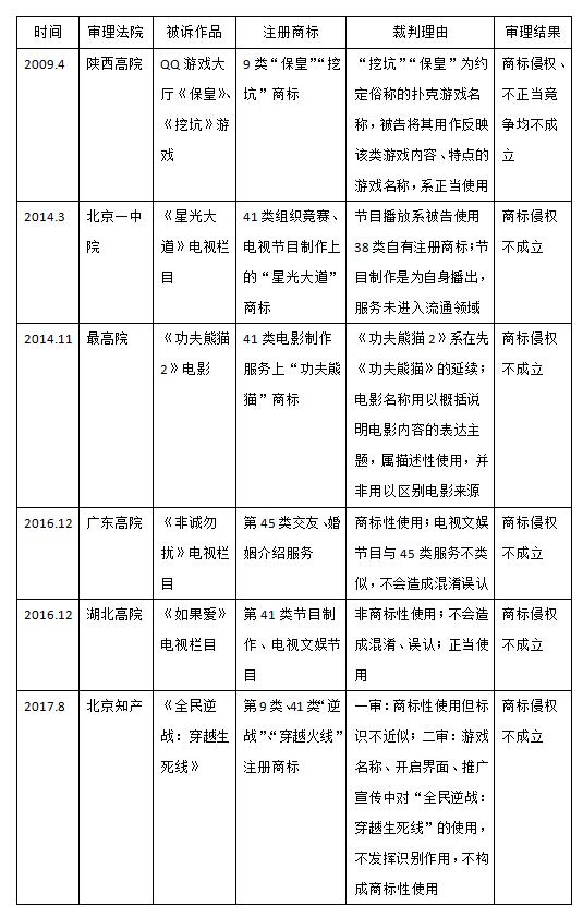 在已決案例中,一部作品的名稱——作品的類型無論是影視節(jié)目還是游戲——如果和在先注冊的商標(biāo)重合了,很少認(rèn)定商標(biāo)侵權(quán)成立的,理由大概有三種:第一,作品名稱并非商標(biāo)性使用,比如被訴侵權(quán)的《功夫熊貓》電影、《如果愛》電視欄目、《全民逆戰(zhàn)——穿越生死線》游戲;第二,作品與在先注冊商標(biāo)核定的商品或服務(wù)不類似,比如被訴侵權(quán)的《星光大道》電視欄目、《非誠勿擾》電視欄目;第三,在先注冊商標(biāo)標(biāo)識,相對于作品的內(nèi)容、主題等特點(diǎn)來說具有直接的描述性,不能禁止他人正當(dāng)使用,比如被訴侵權(quán)的《挖坑》、《?;省酚螒颉I唐奉愃茊栴}和正當(dāng)使用問題,涉及到商標(biāo)標(biāo)識及作品的諸多具體細(xì)節(jié),個案性很強(qiáng);但商標(biāo)性使用問題,幾乎是所有涉及這類沖突的案件中難以繞開的爭議焦點(diǎn)。本文附表二,總結(jié)了各地法院對此類案件的審理情況。