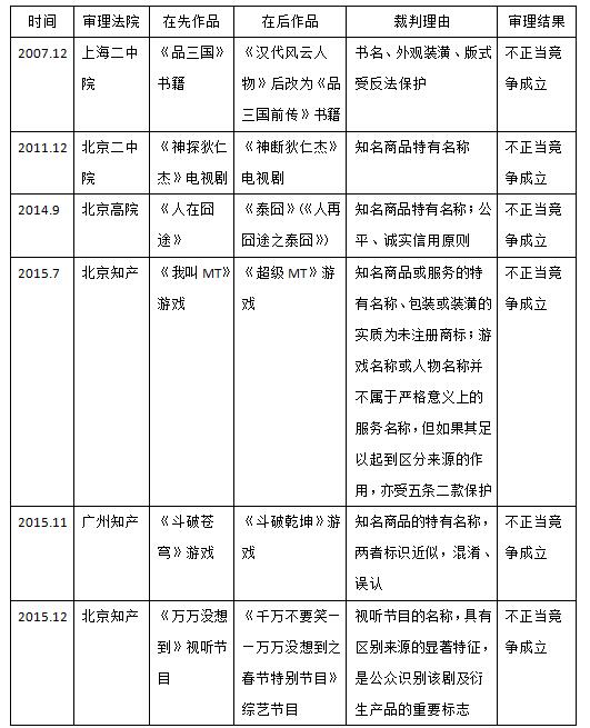 如上所述,這種沖突類型實(shí)際上是比較典型的仿冒之訴。這種沖突發(fā)生在同類作品之間,與發(fā)生在同類商品或服務(wù)之間,并沒有實(shí)質(zhì)上的區(qū)別。此類案件審理的難點(diǎn)在于,能否把原告主張的影視名稱、游戲名稱等作品名稱作為反不正當(dāng)競爭法第五條第二項(xiàng)下的“知名商品的特有名稱”進(jìn)行保護(hù)。在武漢華旗訴光線傳媒、徐崢《泰囧》一案中,法院同時適用了反法第五條第二項(xiàng)和第二條公平、誠實(shí)信用原則條款,以第二條原則性條款來補(bǔ)強(qiáng)適用第五條第二項(xiàng)稍顯牽強(qiáng)的缺憾;在北京知識產(chǎn)權(quán)法院審理的《我叫MT》一案中,法院也注意到“游戲名稱或人物名稱并不屬于嚴(yán)格意義上的服務(wù)名稱”,但認(rèn)為可以將“知名商品/服務(wù)名稱”擴(kuò)大到游戲名稱、人物名稱,條件是“其足以起到區(qū)分來源的作用”。本文附表四總結(jié)了此類案件的審理情況,供讀者參考。