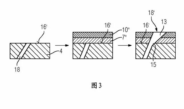 而本申請涉及的是一種重新制造具有擴(kuò)散器的貫通孔的方法,其用于新構(gòu)件。從圖3可知,首先在襯底4中加工出貫通孔18,此時在襯底4中并不具有擴(kuò)散器部分15;然后進(jìn)行覆層;最后制造擴(kuò)散器13,即首次為所述擴(kuò)散器13移除所述襯底4的擴(kuò)散器部分15中的附加的材料。也就是說,在覆層前在襯底4中并不具有擴(kuò)散器部分15。