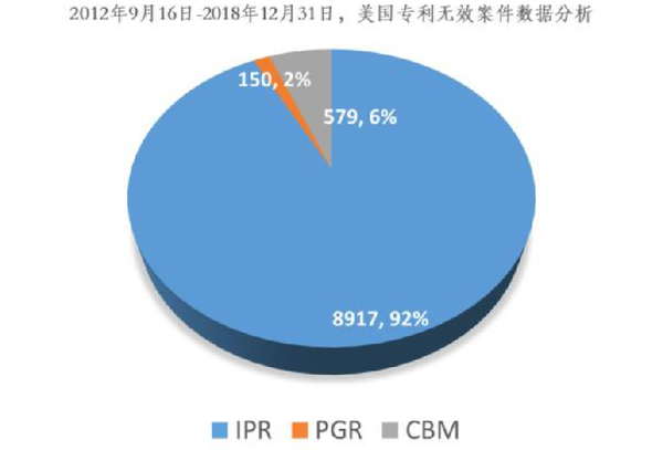 5、根據(jù)USPTO(美國專利商標(biāo)局)公布的2012年9月16日至2018年12月31日美國專利無效案件數(shù)據(jù),在IPR、PGR、CBMR三種無效(復(fù)議)程序中,IPR占比最多,高達(dá)92%,合計為8917件;IPR較少,占比僅為2%,合計150件。從目前的數(shù)據(jù)觀察,IPR是上述三種無效(復(fù)議)程序中最受歡迎的方式。