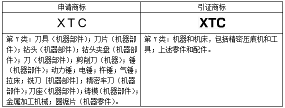 “XTC”商標(biāo)第01;06;07;09;11類馬德里指定新加坡申請被引證英國公司C&T MATRIX LIMITED名下的第7類在先商標(biāo)下發(fā)駁回,部分駁回了申請商標(biāo)在第7類商品上的申請注冊。申請商標(biāo)和引證商標(biāo)信息具體如下: