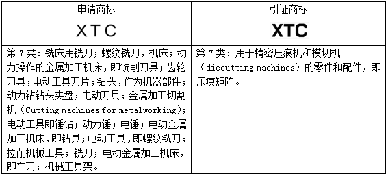 “XTC”商標(biāo)第01;06;07類美國商標(biāo)申請被引證上述相同英國公司C&T MATRIX LIMITED名下的第7類在先商標(biāo)下發(fā)駁回,同樣部分駁回了申請商標(biāo)在第7類商品上的申請注冊。申請商標(biāo)和引證商標(biāo)信息具體如下:
