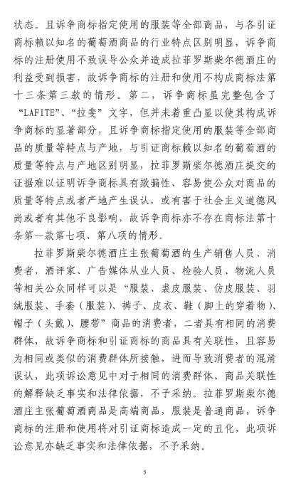 本案是一起適用“淡化”理論保護(hù)馳名商標(biāo)的典型案例。在論理部分,法院指出,訴爭商標(biāo)使用在服裝商品上,會使相關(guān)公眾聯(lián)想到引證商標(biāo),且會認(rèn)識到使用訴爭商標(biāo)的商品并非由拉菲羅斯柴爾德酒莊提供或與之存在特定關(guān)聯(lián)。也就是說,法院認(rèn)為此時混淆、誤認(rèn)的可能性并不存在。但是,這種狀況的存在依然會損害引證商標(biāo)權(quán)利人的利益,因為引證商標(biāo)的顯著性被淡化了,引證商標(biāo)與其權(quán)利人之間的固定聯(lián)系被破壞了。