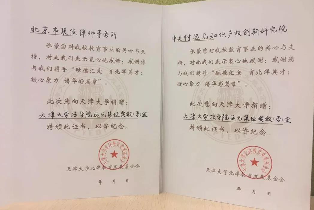 2019年1月中旬,天津大學(xué)北洋教育發(fā)展基金會又專程給集佳送來“捐資證書”,感謝集佳攜手遠(yuǎn)見創(chuàng)新研究院通過這一公益之舉,支持與資助天津大學(xué)的教育事業(yè)。
