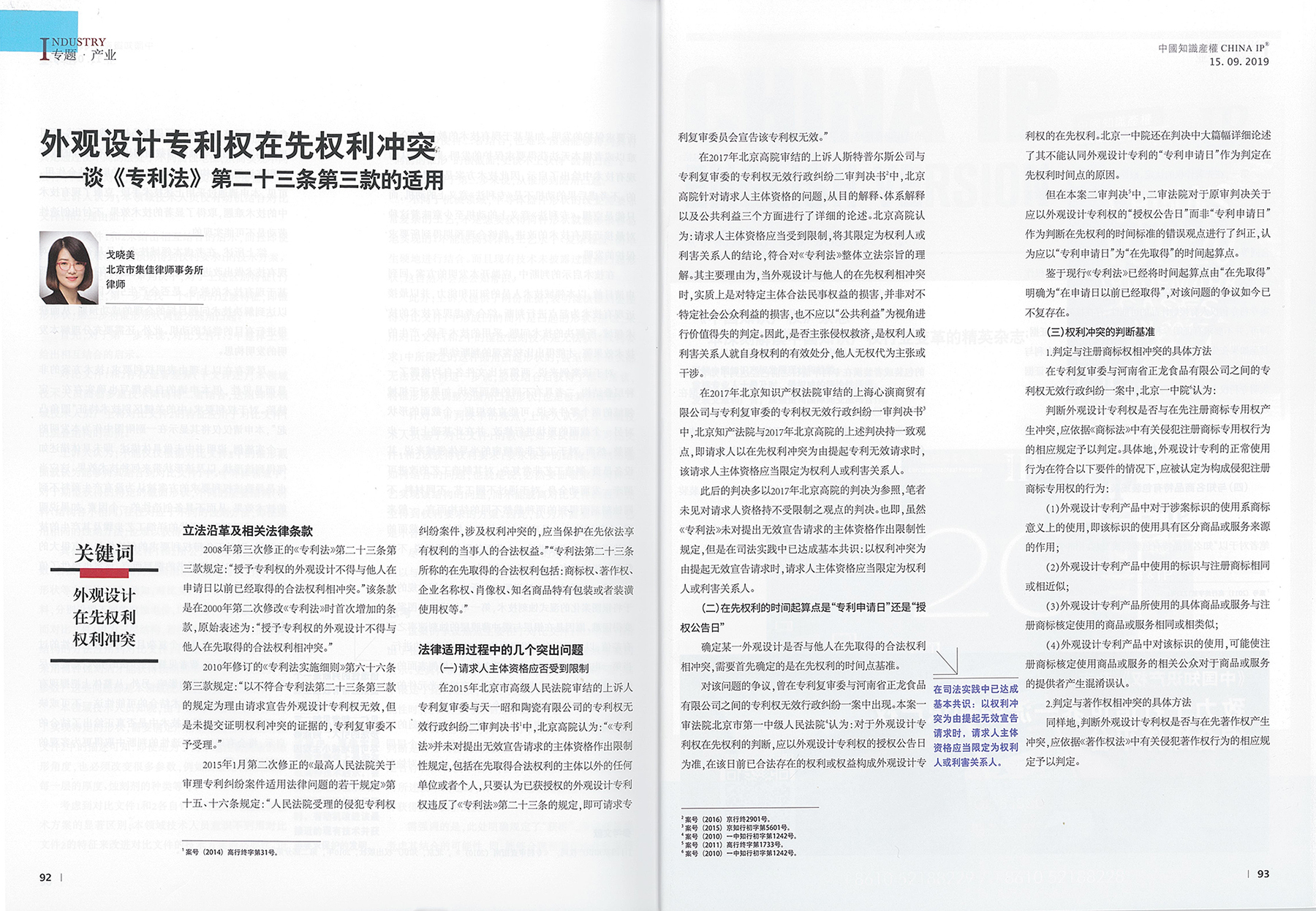 集佳文章《外觀設(shè)計專利權(quán)在先權(quán)利沖突——談<專利法>第二十三條第三款的適用》在《中國知識產(chǎn)權(quán)》 發(fā)表