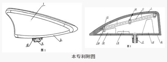 該專利的權(quán)利要求1內(nèi)容為“一種鯊魚鰭式天線,其特征在于具有天線外殼,天線外殼內(nèi)側(cè)上部設(shè)置有無線電接收天線,無線電接收天線一端設(shè)有天線信號輸出端,天線信號輸出端通過天線連接元件與天線放大器信號輸入端相連接,或直接與同軸電纜匹配相連,天線外殼底部裝有安裝底板;所述無線電接收天線通過注塑嵌裝或固定卡裝在天線外殼內(nèi)側(cè)上部;在天線外殼內(nèi)側(cè)上部設(shè)置有無線電接收天線,所述無線電接收天線采用螺旋狀彈簧天線、或金屬天線,增加了天線接收無線電信號的有效長度,實現(xiàn)360度全向性信號接收;所述無線電接收天線為AM/FM共用天線。”
