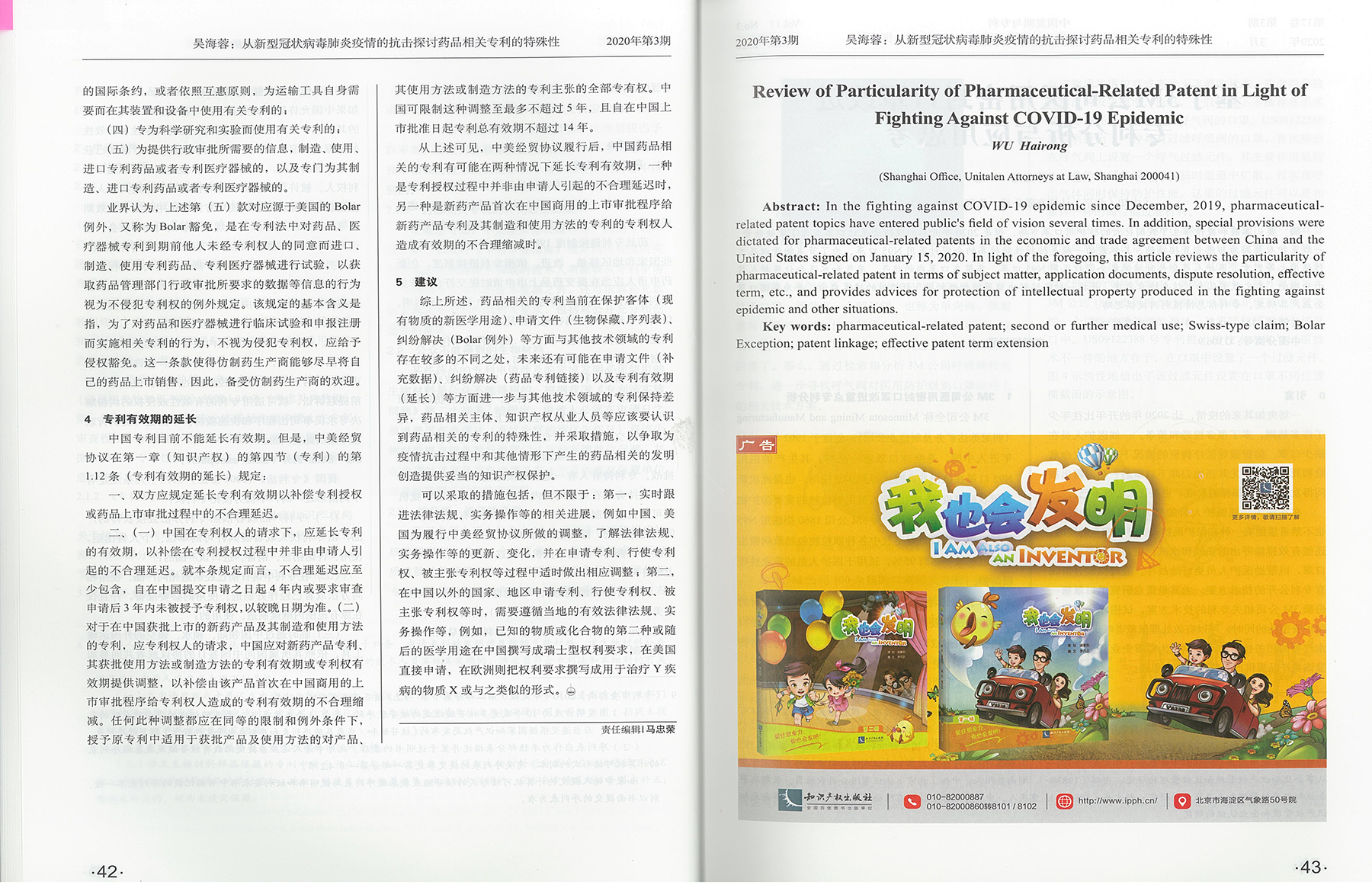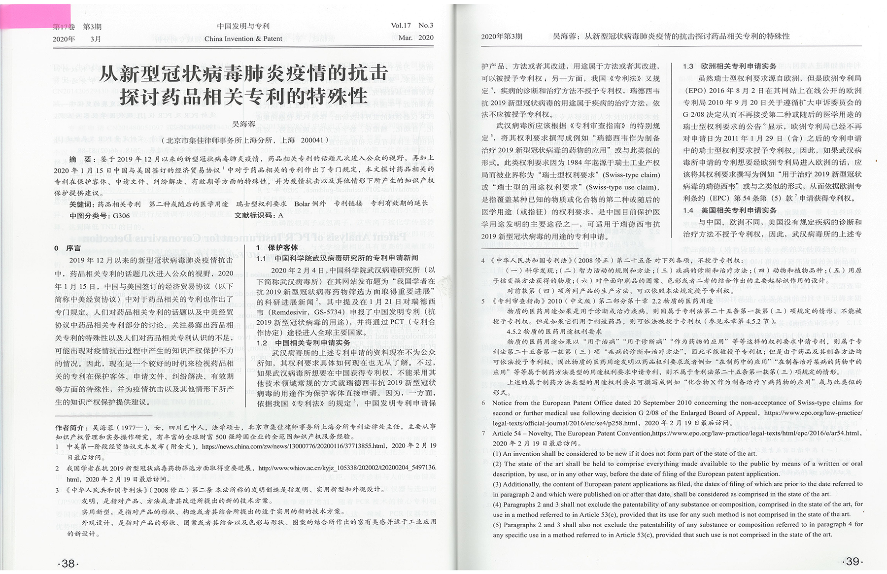 集佳文章《從新型冠狀病毒肺炎疫情的抗擊探討藥品相關專利的特殊性》在《中國發(fā)明與專利》發(fā)表
