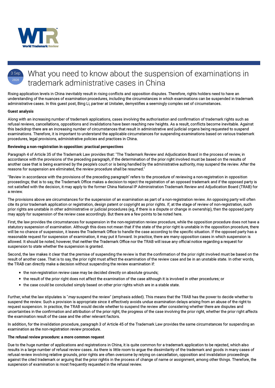 集佳文章《What you need to know about the suspension of examinations in trademark administrative cases in China》在《WTR》發(fā)表