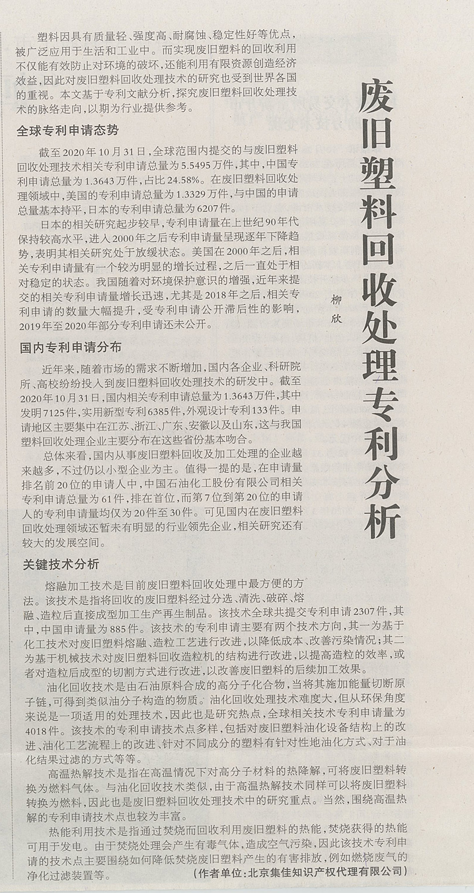 集佳文章《廢舊塑料回收處理專利分析》在《中國知識產(chǎn)權(quán)報》發(fā)表