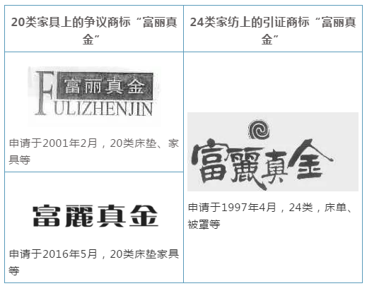 在上述不正當(dāng)競爭糾紛取得勝訴之后,富麗真金家紡先后針對富麗真金家具兩枚注冊商標(biāo),提起無效宣告。