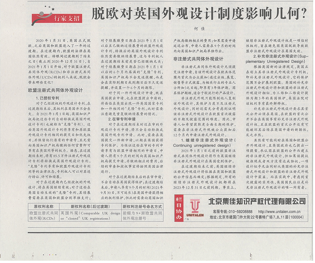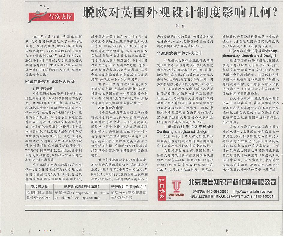 集佳文章《脫歐對(duì)英國(guó)外觀設(shè)計(jì)制度影響幾何?》在《中國(guó)知識(shí)產(chǎn)權(quán)報(bào)》發(fā)表