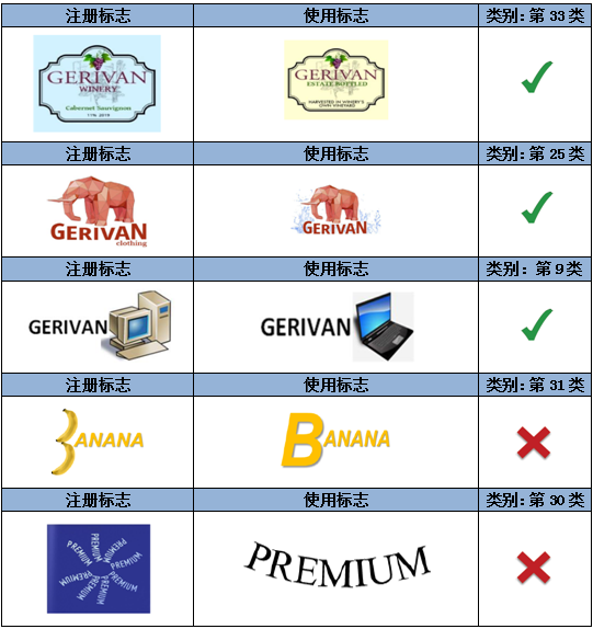 需要留意的是,對(duì)于黑白商標(biāo)和彩色商標(biāo),更換顏色(如黑白更換為彩色,或彩色更換為黑白),與國(guó)內(nèi)的判斷標(biāo)準(zhǔn)稍有不同。根據(jù)本指南,顏色更改是否構(gòu)成注冊(cè)標(biāo)志的實(shí)質(zhì)變更,判斷標(biāo)準(zhǔn)仍主要取決于是否對(duì)注冊(cè)標(biāo)志的顯著要素構(gòu)成更改,換句話說,“顏色”是否為該注冊(cè)標(biāo)志的顯著要素。如上述示例七中第二組,指定商品為第31類“香蕉”,因此,該注冊(cè)標(biāo)志中的“粉色”為該注冊(cè)商標(biāo)的主要顯著部分,更改為其他顏色則構(gòu)成實(shí)質(zhì)變更,而如上述示例七中的第一、三組,顏色并非注冊(cè)商標(biāo)的主要顯著部分,則可以在使用中更換標(biāo)志的顏色。