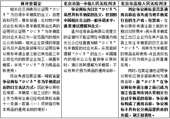 比如,2007年11月14日,“浙江三豐水產(chǎn)食品有限公司”注冊了第4525535號“ひじき”商標,核定使用在第29類“貝殼類動物(非活)、干食用菌、海菜、海帶、水產(chǎn)罐頭、蝦(非活)、羊棲菜(加工過的)、魚(非活的)、紫菜”商品上。2010年9月3日,溫州佳海食品有限公司針對該商標提起撤銷申請,撤銷理由為:“ひじき”是出口企業(yè)普遍使用的羊棲菜的日文名稱,該案審理結(jié)果如下:
