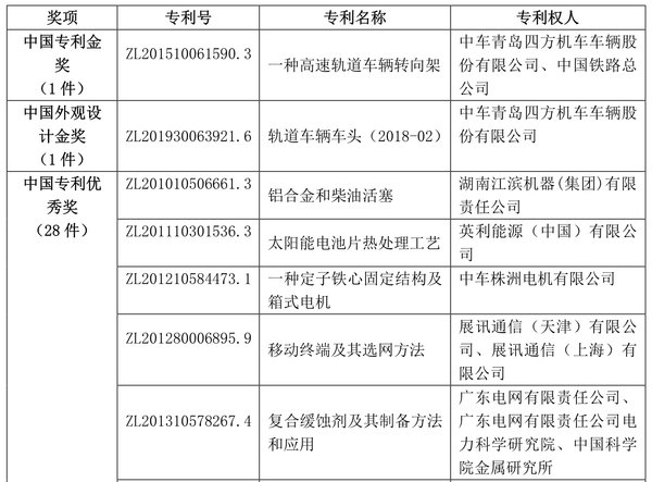 6月25日,國(guó)家知識(shí)產(chǎn)權(quán)局發(fā)布了第二十二屆中國(guó)專利獎(jiǎng)授獎(jiǎng)決定,為30項(xiàng)發(fā)明、實(shí)用新型專利授予中國(guó)專利金獎(jiǎng),10項(xiàng)外觀設(shè)計(jì)專利授予中國(guó)外觀設(shè)計(jì)金獎(jiǎng),60項(xiàng)發(fā)明、實(shí)用新型專利中國(guó)專利銀獎(jiǎng),15項(xiàng)外觀設(shè)計(jì)專利中國(guó)外觀設(shè)計(jì)銀獎(jiǎng),825項(xiàng)發(fā)明、實(shí)用新型專利中國(guó)專利優(yōu)秀獎(jiǎng),56項(xiàng)外觀設(shè)計(jì)專利中國(guó)外觀設(shè)計(jì)優(yōu)秀獎(jiǎng)。