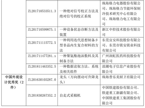 其中,集佳代理的32項(xiàng)專利獲獎(jiǎng),包括1個(gè)中國(guó)專利金獎(jiǎng),1個(gè)外觀設(shè)計(jì)金獎(jiǎng),28個(gè)中國(guó)專利優(yōu)秀獎(jiǎng),以及2個(gè)中國(guó)外觀設(shè)計(jì)優(yōu)秀獎(jiǎng)。