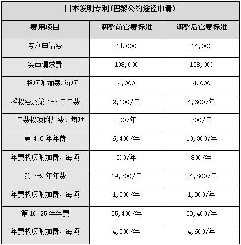本次官費調整專利發(fā)明方面主要是上調了年費,具體如下(幣種:日元):