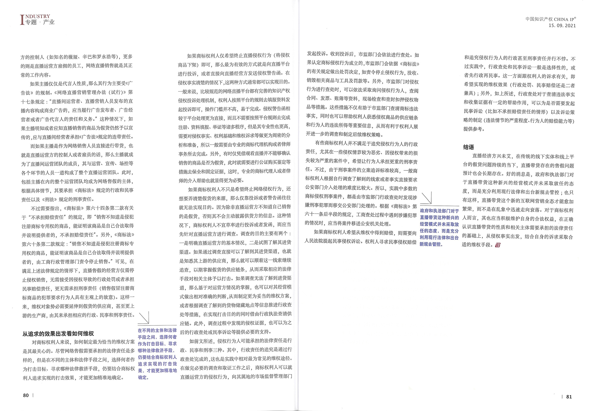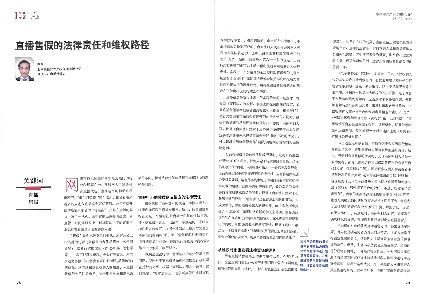 集佳文章《直播售假的法律責任和維權(quán)途徑》在《中國知識產(chǎn)權(quán)》發(fā)表
