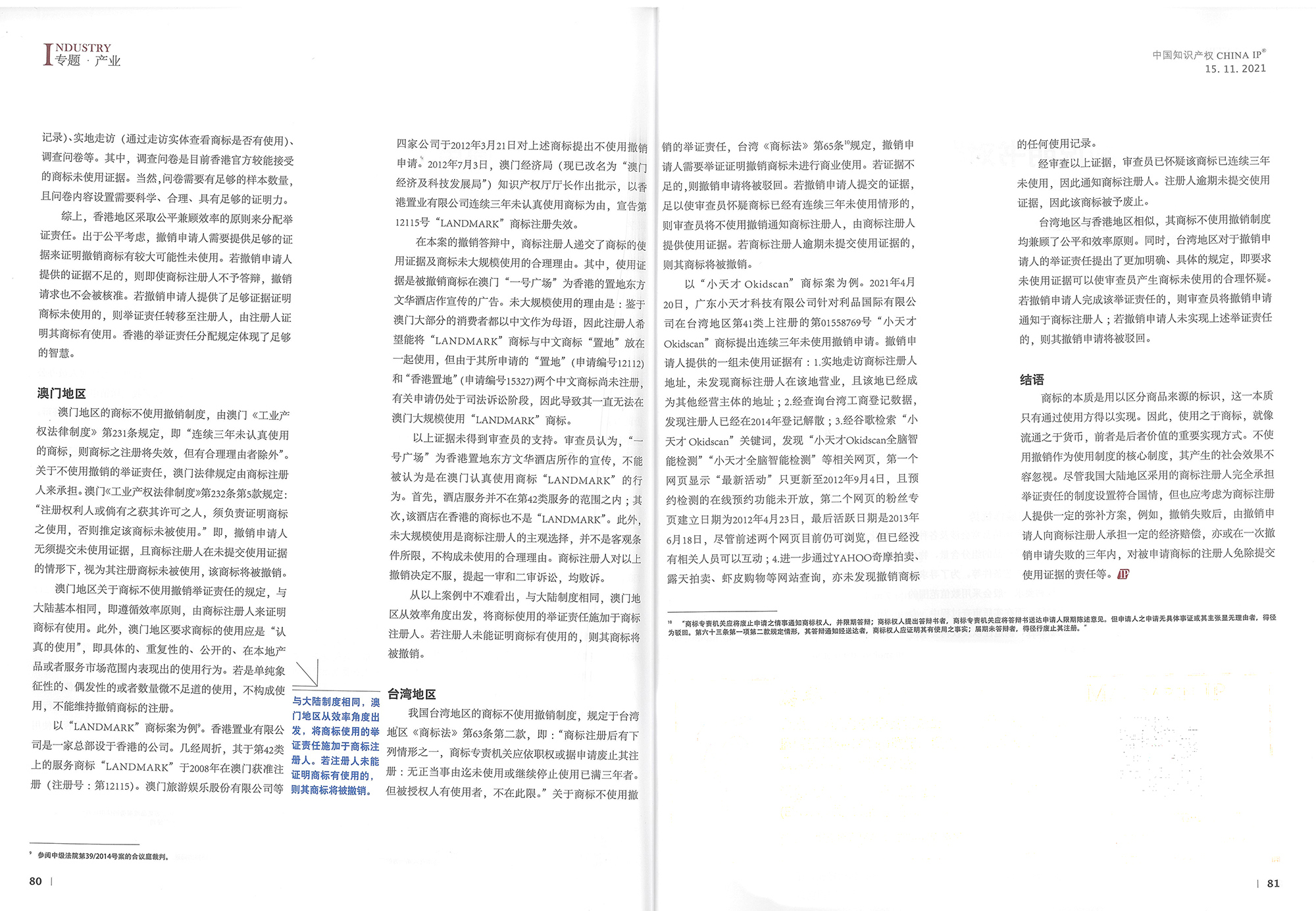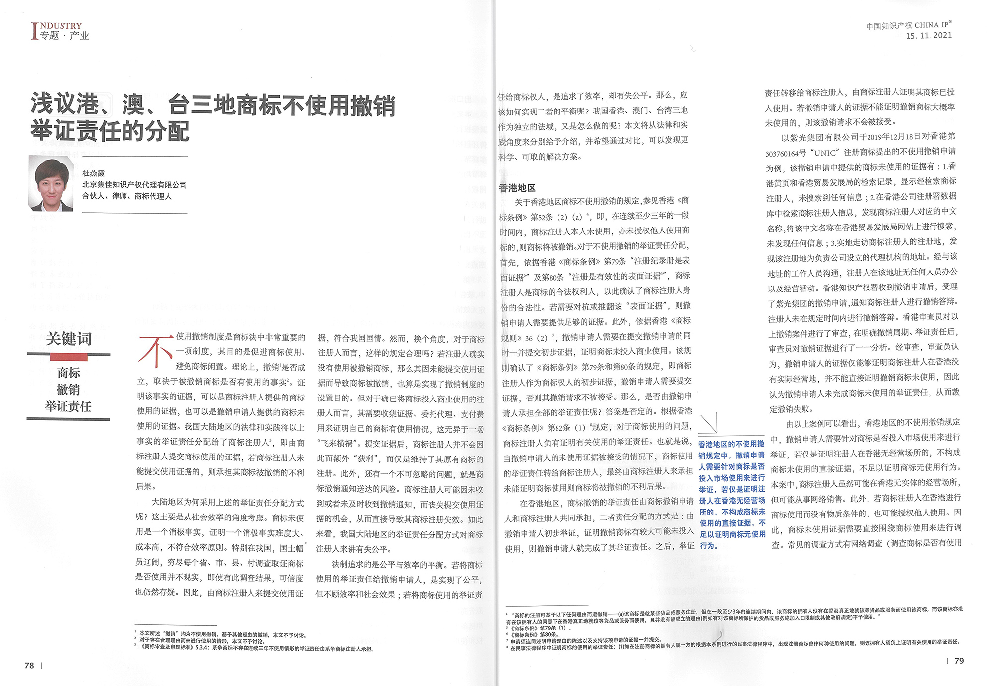 集佳文章《淺議港、澳、臺三地商標(biāo)不使用撤銷舉證責(zé)任的分配》在《中國知識產(chǎn)權(quán)》發(fā)表