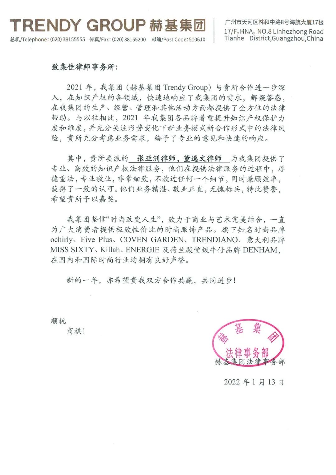 新春佳節(jié)將至,集佳收到赫基集團發(fā)來的表揚信,贊譽集佳律師事務(wù)所張亞洲律師和董逸文律師專業(yè)、高效的知識產(chǎn)權(quán)法律服務(wù)。