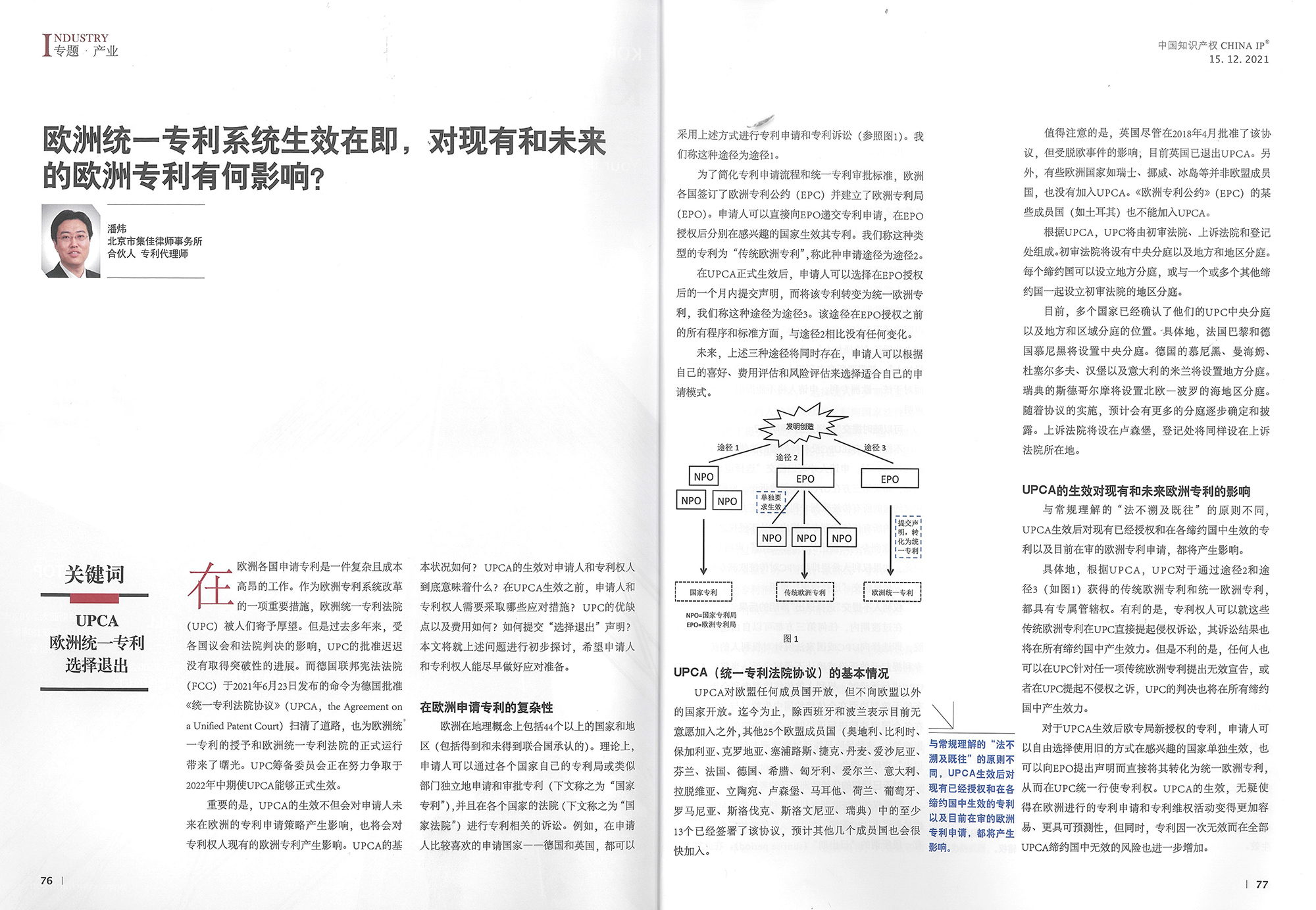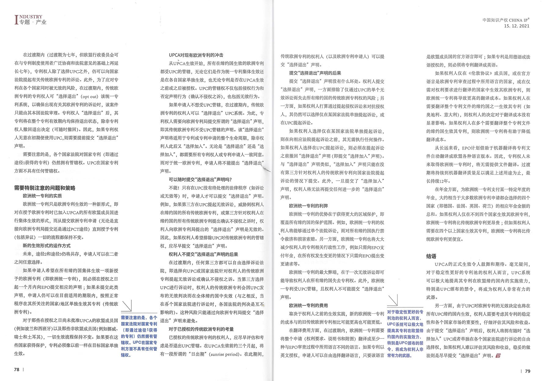 集佳文章《歐洲統(tǒng)一專利系統(tǒng)生效在即,對現有和未來的歐洲專利有何影響?》在《中國知識產權》發(fā)表