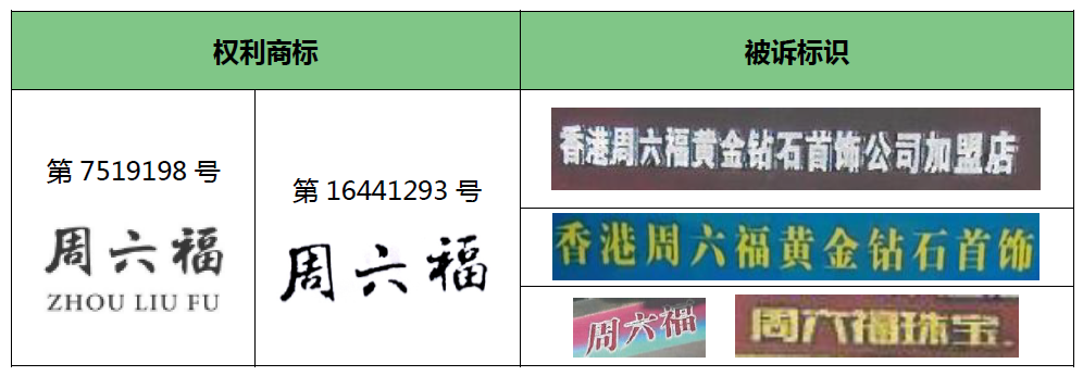 原審兩被告(中百珠寶首飾行和陳埭鎮(zhèn)周六福珠寶店)在其店鋪背景墻、店鋪招牌、首飾柜臺(tái)、首飾盒、廣告牌、包裝袋、首飾盒、質(zhì)保單等多處使用上述被訴標(biāo)識(shí),其抗辯理由:一是此種使用方式系對(duì)特許人企業(yè)名稱的合理使用而非商標(biāo)性使用行為;二是特許人享有在先使用權(quán)。一審判決認(rèn)定突出使用“周六?!钡摹?a href="/res/unitalen/2206/22063849.png">