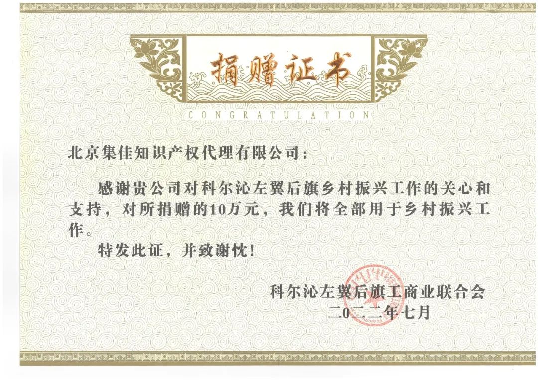 近日,集佳知識(shí)產(chǎn)權(quán)積極響應(yīng)朝陽區(qū)工商聯(lián)的鄉(xiāng)村振興幫扶倡議,捐資10萬元支持內(nèi)蒙古自治區(qū)科爾沁左翼后旗鄉(xiāng)村振興建設(shè),并收到科爾沁左翼后旗工商業(yè)聯(lián)合會(huì)的致謝。