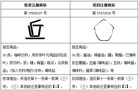 上表中被駁回案例,商標(biāo)整體由兩筆線條勾勒而成,且外觀十分容易聯(lián)想為其指定商品“醬油;辣醬油;醋”的容器外型,過于寫實(shí)的構(gòu)圖使消費(fèi)者難以從中提取出獨(dú)屬于商標(biāo)申請人的具體指向和概念,因此,即使該圖形并非相關(guān)行業(yè)常用的普通圖形,卻也難以起到區(qū)分商品來源的作用。