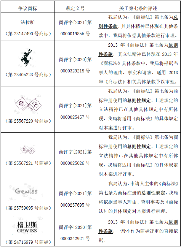 而在過往大多數(shù)異議、無效宣告案件中,“誠實(shí)信用原則”都被評價(jià)為“總則性條款”或“原則性條款”,例如,下表所列的6件無效宣告案件均將申請人基于第七條的評審請求評述為“總則性條款”,認(rèn)為誠實(shí)信用原則具體精神已體現(xiàn)在其他條款中,案件需依據(jù)其他具體性條款進(jìn)行評價(jià):