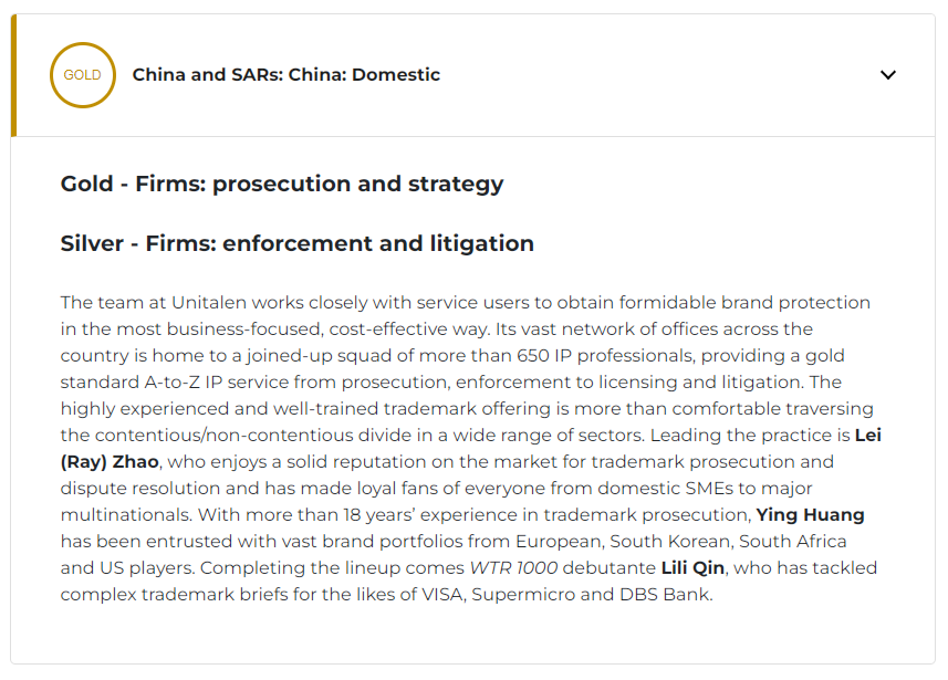 WTR評價:“作為團隊的領軍人物,趙雷律師在商標申請和爭端解決方面享有卓著聲譽,在從國內中小企業(yè)到大型跨國公司中都擁有的忠實擁躉。”