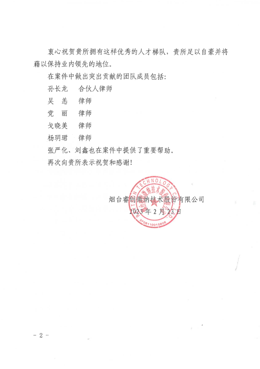 圖1 睿創(chuàng)集團向集佳律所寄送的表揚信