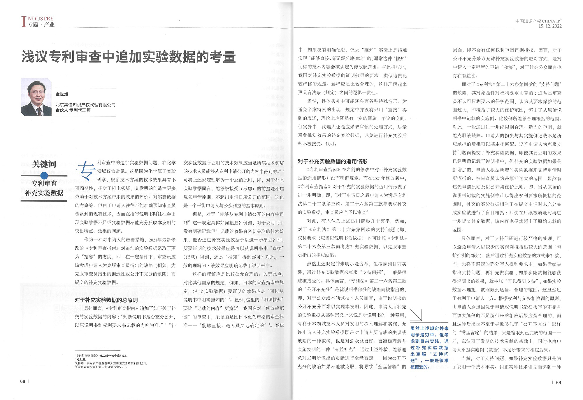 集佳文章《淺議專利審查中追加實驗數(shù)據(jù)的考量》在《中國知識產(chǎn)權(quán)》發(fā)表