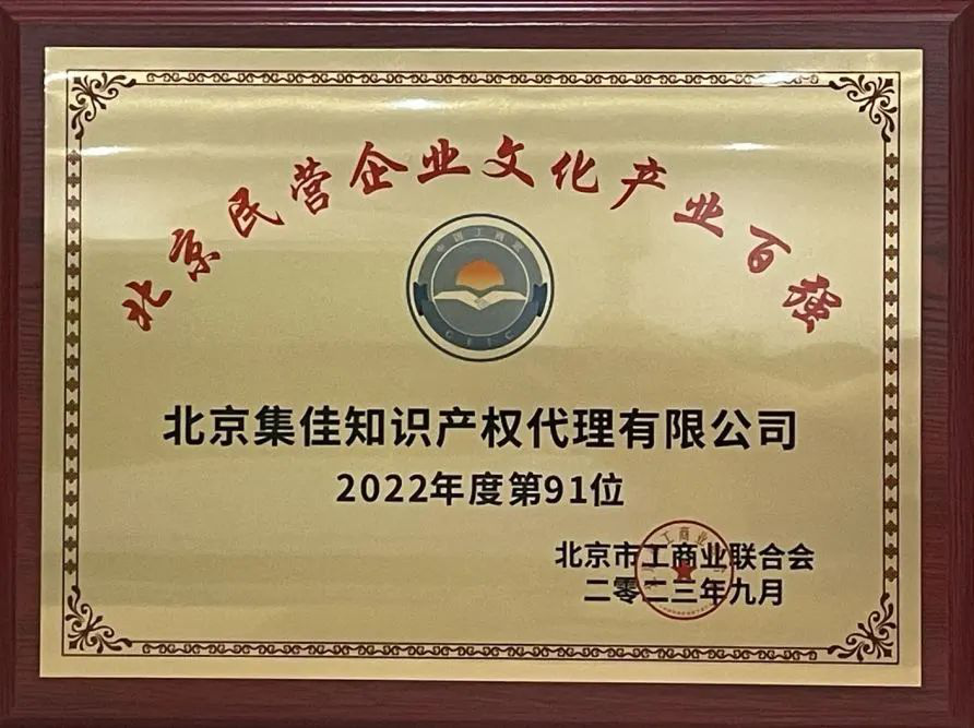 此次獲評“北京民營企業(yè)文化產(chǎn)業(yè)百強”,是北京市工商聯(lián)及有關部門對集佳綜合實力的肯定和信任。未來,集佳將再接再厲,積極響應政策與號召,主動承擔民營企業(yè)的責任與擔當,為首都經(jīng)濟社會的健康發(fā)展、為知識產(chǎn)權服務業(yè)建設貢獻集佳力量。