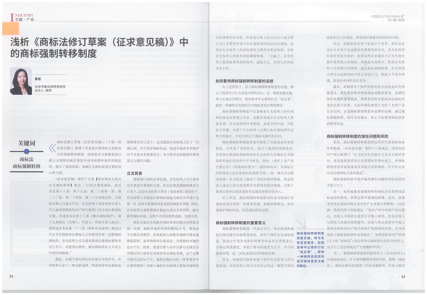集佳文章《淺析<商標(biāo)法修訂草案(征求意見稿)>中的商標(biāo)強(qiáng)制轉(zhuǎn)移制度》在《中國(guó)知識(shí)產(chǎn)權(quán)》發(fā)表