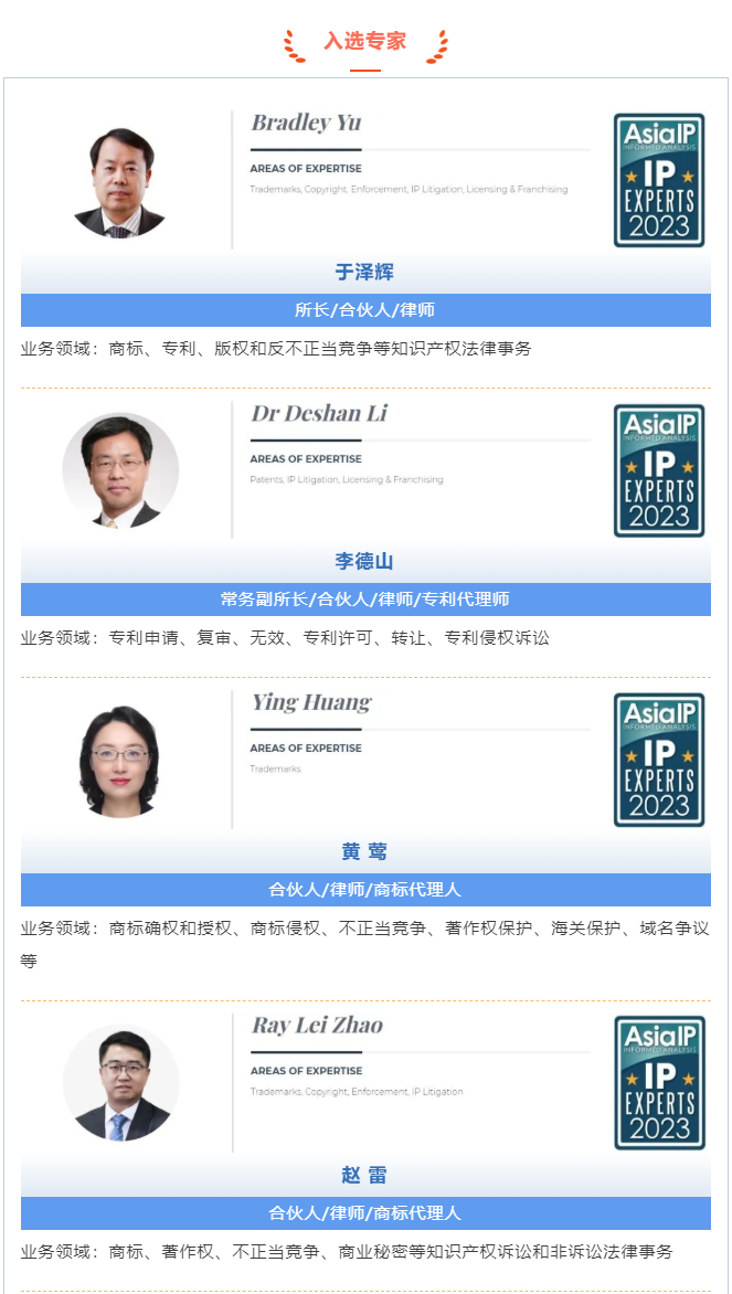 近日,國際權(quán)威知識產(chǎn)權(quán)媒體《亞洲知識產(chǎn)權(quán)》(Asia IP)發(fā)布了2023年度“中國知識產(chǎn)權(quán)專家百強榜”(Top 100 IP Experts in China),集佳于澤輝、李德山、黃鶯、趙雷、潘煒5位合伙人因其優(yōu)質(zhì)的專業(yè)服務及海內(nèi)外業(yè)界與客戶的普遍認可榮登百強榜單!